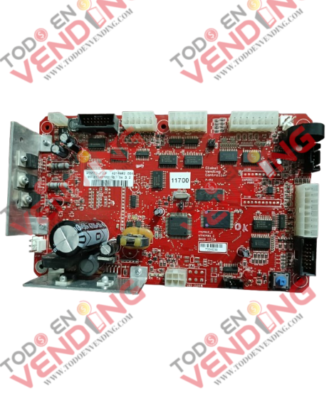 Esta tarjeta de color rojo se identifica fácilmente por su diseño robusto, conectores industriales y su capacidad para gestionar múltiples motores de venta y componentes auxiliares como elevadores, sensores ópticos y validadores de pago. También permite la configuración de opciones avanzadas como Multi-Vend, Health & Safety, Free Vend, y mensajes promocionales.